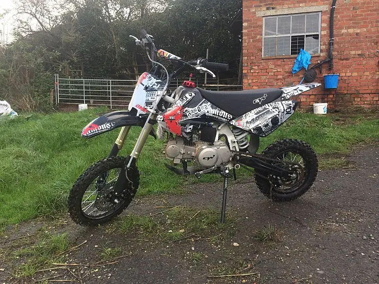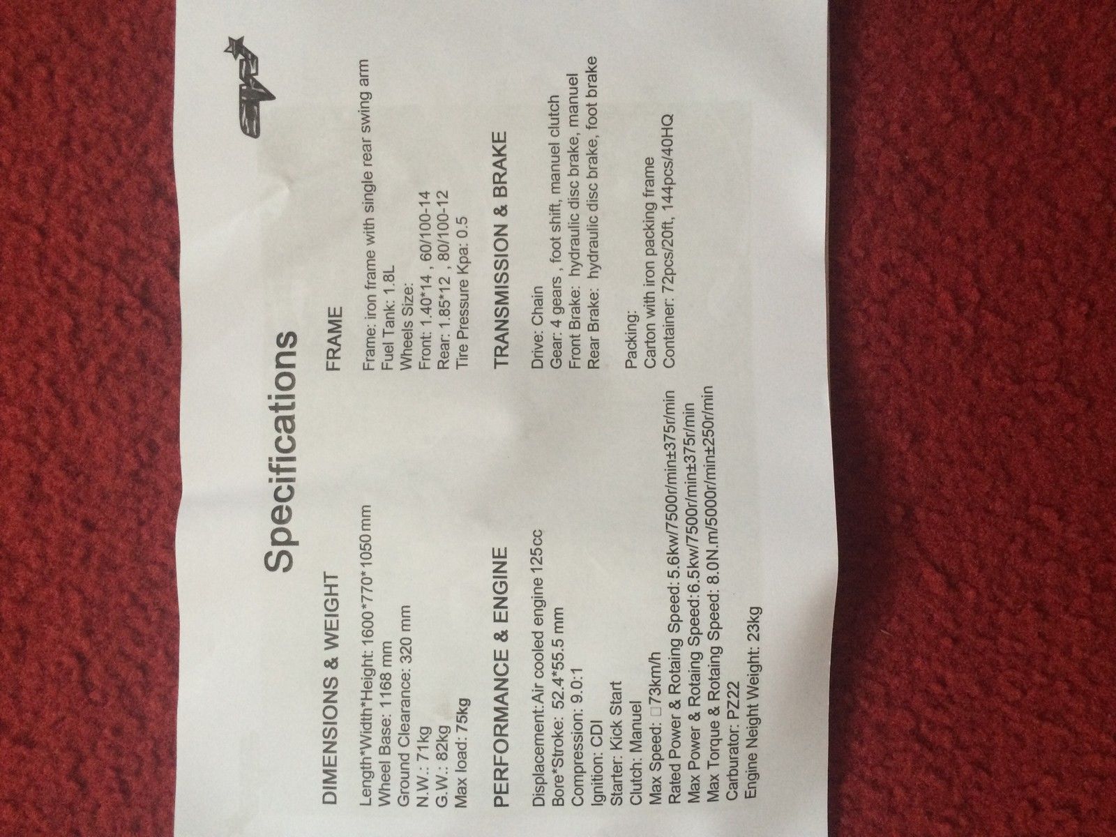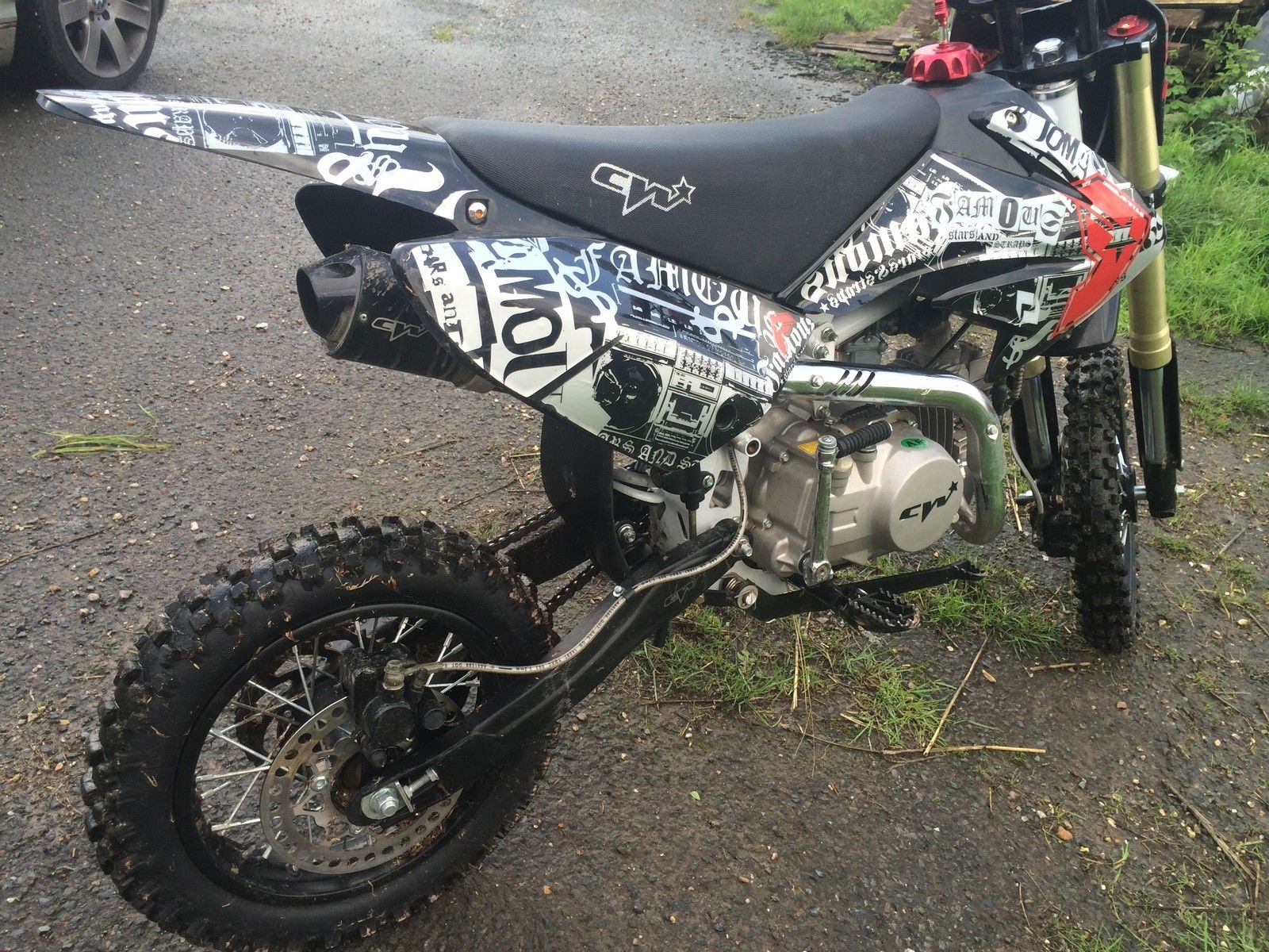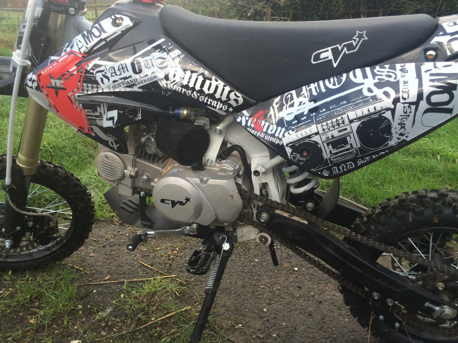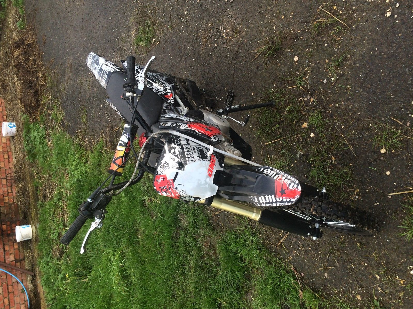 I bought this bike brand new about 6 months ago and due to lack of time I have only ridden it 3 or 4 times. Every time it has been taken out it has been allowed to warm up properly before riding and has been run in properly. I have changed the oil since I have had it. Bike starts and rides well and has plenty of pull. It is in good condition. The bike benefits from a few extras including upside down forks. folding back clutch / brake levers and after market "famous Stars and Stripes" stickers. The stickers have started to peel on the corner but could be easily stuck back down. I still have original handbook and toolkit. Cash on collection only. Thanks for looking and happy bidding.