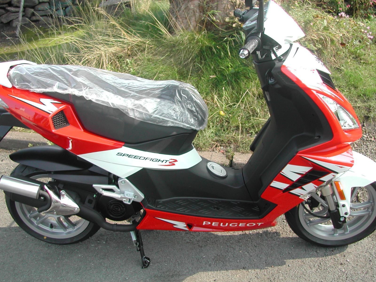 BRAND NEW PEUGEOT SPEEDFIGHT 3 2012 IN RED Engine: 50cc Stroke: 2 stroke Transmission: Auto Cooling: Air Cooled Seat Height : 800mm Brakes: Front Disc. Rear Drum Central to the new design is the revised chassis. with the fuel tank relocated to a central position under the floor pan. which significantly lowers the centre of gravity. Combined with 32mm hydraulic forks (replacing the single arm on previous models) and larger 13?” wheels. this gives class-leading handling. Braking gets the latest technology too ?– for the first time Peugeot have fitted a dual piston radial calliper. which works with the 215mm Shuricane front disc brake for powerful and controllable stopping power. The relocated fuel tank is expanded to hold 8. 5 litres (2 gallons). so the Speedfight 3 has a potential range of up to 150 miles. Under the seat is a substantial storage bay and there is even a dual function 12V socket so that mobile phones can be charged on the move. ON THE ROAD PRICE £1799. 00 Warranty Included. £99+vat UK Delivery