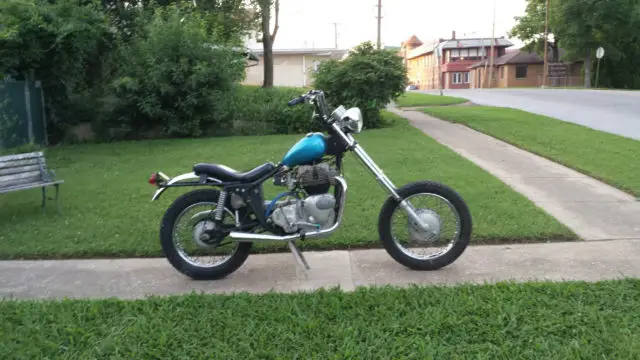 The original forks have been extended and have a fork brace. The frame head has not been raked, as been shortened underneath the Wassel fuel tank, hich kicks out the frame head to allow for a longer front fork. Can be brought back to stock fork angle by putting a small tube back in the backbone of the frame, hen you can install shorter tubes in the forks so they sit stock again.