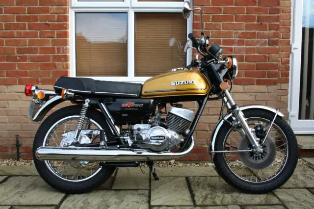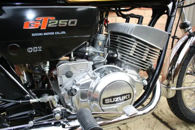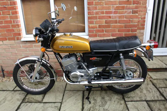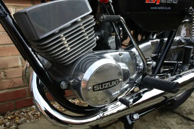 1978 SUZUKI GT 250. FULLY RESTORED MATCHING NUMBERS CONCOURS SHOW BIKE. WELCOME TO THE VERY RELUCTANT AUCTION OF MY SUZUKI. NEEDS MUST AND I HAVE TO RAISE SOME CASH TOWARDS A NEW CAR. WHAT CAN I SAY. SHE IS IN STUNNING CONDITION AND A CREDIT TO THE PREVIOUS OWNER WHO HAD LAVISHED MUCH TIME. EFFORT AND MONEY ON GETTING HER TO THIS SORT OF CONDITION. I ONLY BOUGHT HER LAST YEAR WITH THE INTENSION OF KEEPING HER AS AN INVESTMENT AND TAKE HER TO THE ODD SHOW BUT CIRCUMSTANCES CHANGED AND SHE HAS TO GO. GLORIOUS SOUNDING TWO STROKE FULLY REBUILT ABOUT A HUNDRED MILES AGO STARTS FIRST OR SECOND KICK EVERY TIME. I HAVE PLENTY OF OLD MOT'S BUT NO HISTORY REGARDING HER RESTORATION. SHE WAS ORIGINALLY BLUE AND STILL MARKED AS BLUE ON THE V5. ANY QUESTIONS OR TO BOOK AN APPOINTMENT FOR A VIEWING PLEASE CALL ME ON 07921 682575. SERIOUS BIDDERS ONLY PLEASE. A SENSIBLE STARTING BID WITH NO RESERVE ENSURES SOMEONE COULD GET AN INVESTMENT BARGAIN. CASH ON COLLECTION ONLY. GOOD LUCK.
