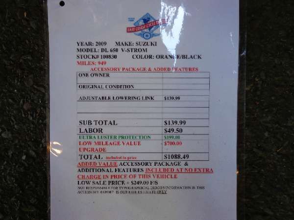 METALLIC ORANGE/BLACK LIKE NEW CONDITION ONLY 949 ORIGINAL MILESIf you're looking for adventure here's the machine to help you find it - the V-Strom 650. It combines the versatile performance of the V-Strom 1000 with exciting middleweight agility. With its height-adjustable aerodynamic windshield and spacious riding position the V-Strom 650 is designed for smooth comfortable performance on the highway. In addition it has an extra-large fuel tank for extended riding. It's equally at home around town thanks to its low seat height light weight and overall crisp handling. And the V-Strom's V-twin engine adds excitement to every ride offering a wide powerband and strong acceleration in every gear. What really sets the V-Strom apart from other street bikes of course is its unmatched versatility. Its lightweight agile handling inspires confidence while its smooth suspension front and rear performs exceptionally well in almost any situation. It's time to get in on the adventure - with the Suzuki V-Strom 650. ? ? All can be explained with a simple phone call. 215-639-3245?»?