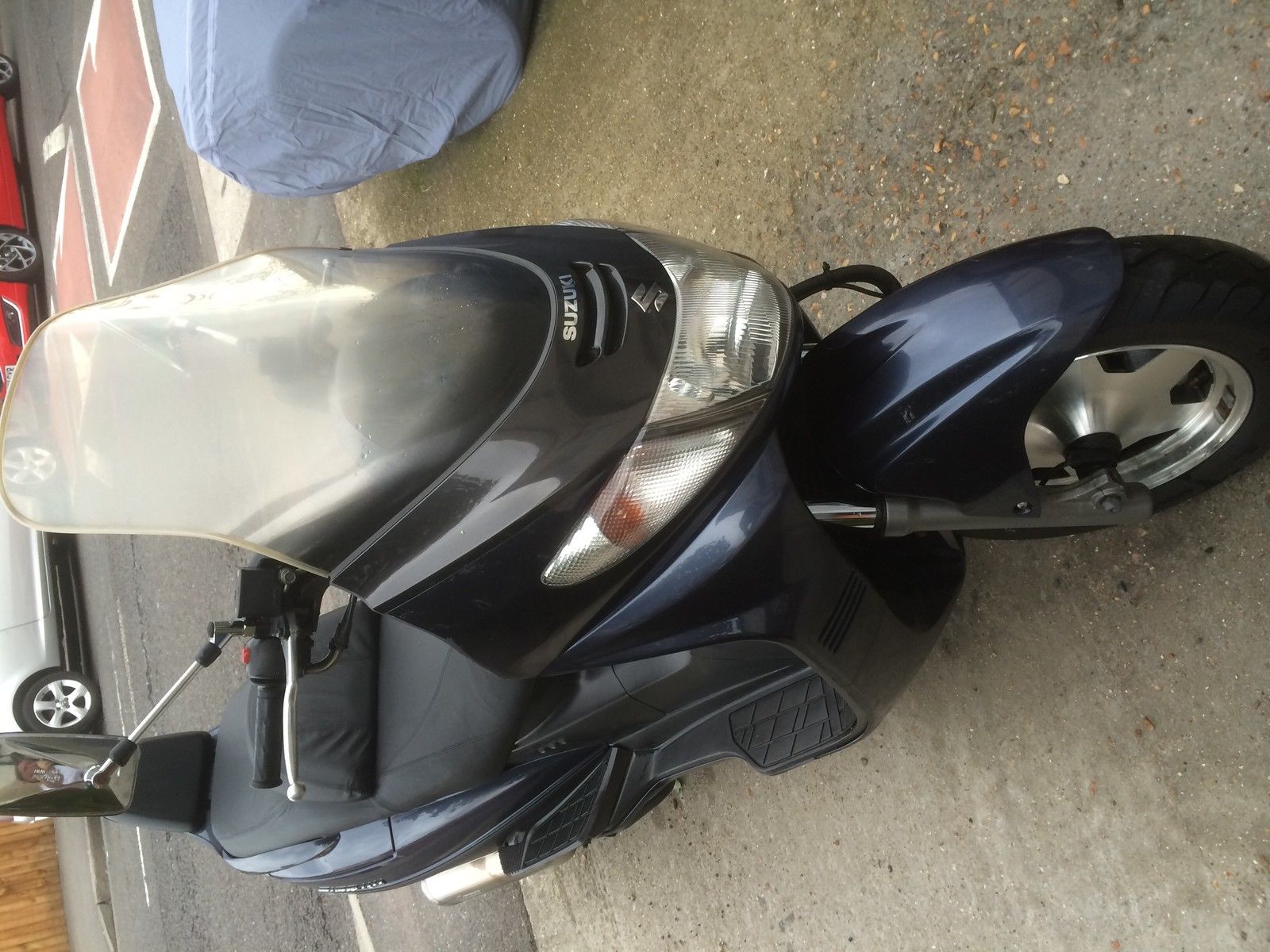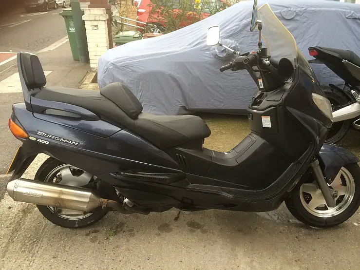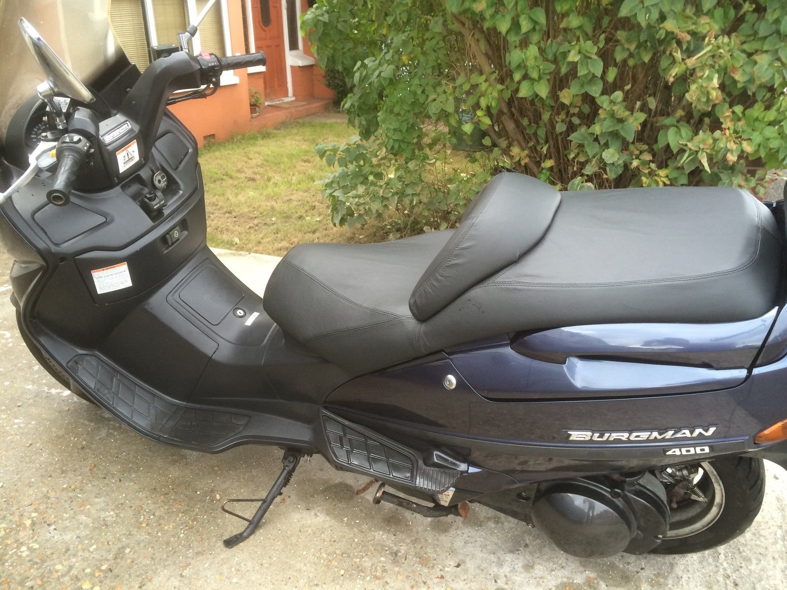 Suzuki Burgman AN 400 27. 00 miles Just had a brand new drive belt fitted with new spark and oil + filter (Done by myself) I have also just fitted a brand new leather seat cover as the nylon one had split and looked untidy Front pads recently done too I fitted a new battery around May time MOT and tax til end of Jan 2015 2 sets of keys and V5 present 3 previous owners Service history in the way of receipts and service lists I bought this bike for commuting to a new job across London and have since bought a brand new bike so this one has to go I also have the rear box and frame for extra storage I removed as I didn't need it. It goes with the bike The only bad point is that I had a low speed spill which has scratched some of the fairing. Please see pics. The damage is only cosmetic Nice comfortable ride. goes and stops well. Good for the winter weather approaching as you are shielded from the wind and rain! VERY CHEAP ON FUEL AND INSURANCE! Viewing welcome - please no time wasters as I am normally very busy. Bike is located in DA16/SE London Cash on collection Any questions please call me on 07920405328