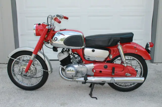 Bike fires right up and the engine sounds very nice with no abnormal piston slap or other noises. Clutch pulls easily, hrottle is smooth and easy to twist. Clutch operates perfect with no slippage. Bike shifts perfectly into all 4 gears, nd it rides really nice and smooth. Sounds really good too. Has a new battery, owever it's smaller that what it should have, o the electric start barely works. Battery also needed a small piece of wood addedfor a tighter fit. (I ordered the incorrect battery) With a charger hooked up the electric start also works perfectly. Has a brand new NOS voltage regulator/starter solenoid as well. All the lights work, eadlight high and low, ail/brake light, eutral light. This model never had turn signals, nd it still does not. There is a broken switch on the left handlebar switch, owever I'm not sure what the switch actually controlled.