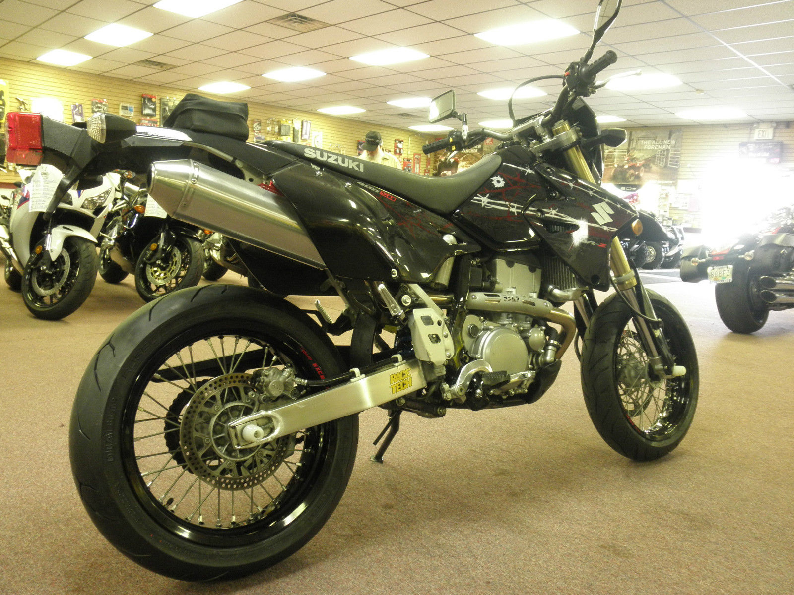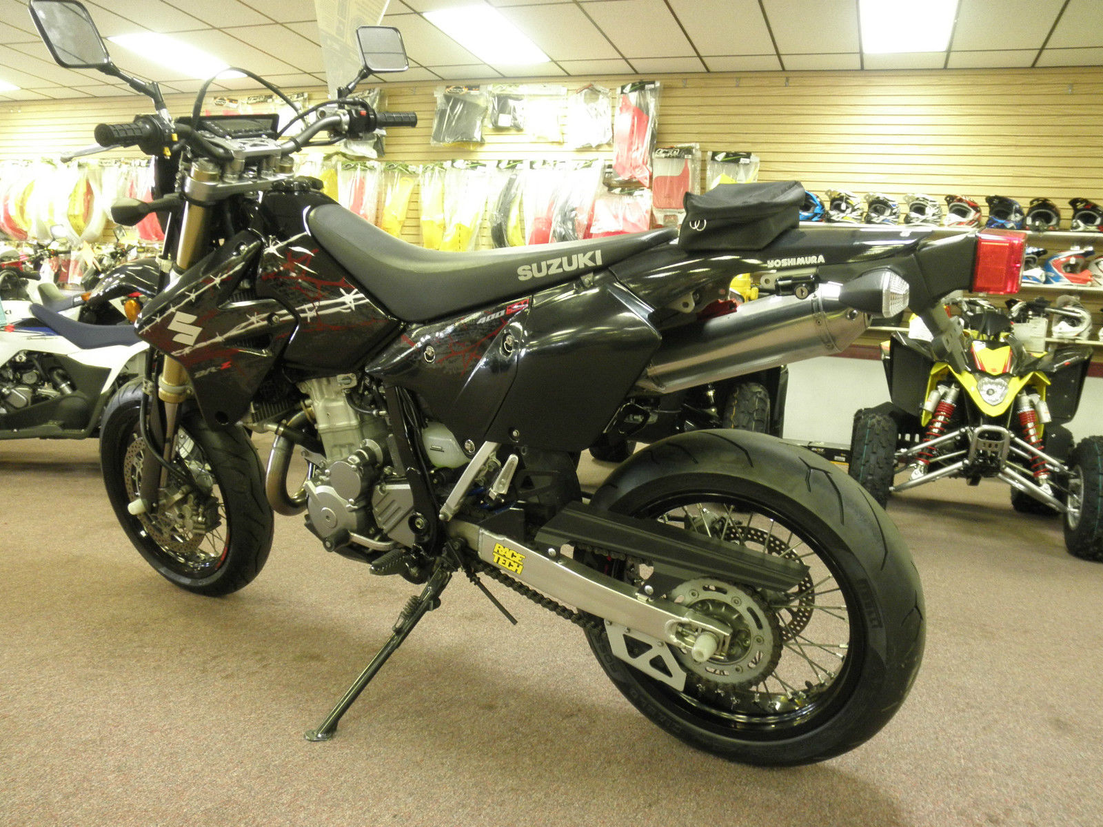 We have up for bids a very clean and meticulously maintained 2009 Suzuki DR-Z400SM Super Moto. Bike has 13. 86 miles and has a clear title in hand. Had a fresh piston. rings. and gaskets installed professionally about 1500 miles ago. This motorcycle has brand new Pirelli tires front and rear. full Yoshimura exhaust. lowering springs with a Race Tech rear spring and the front forks dropped slightly. Excellent stance and easy for anyone to ride. Comes with a service manual. handguards. and most all of the stock parts. You won't be disappointed!