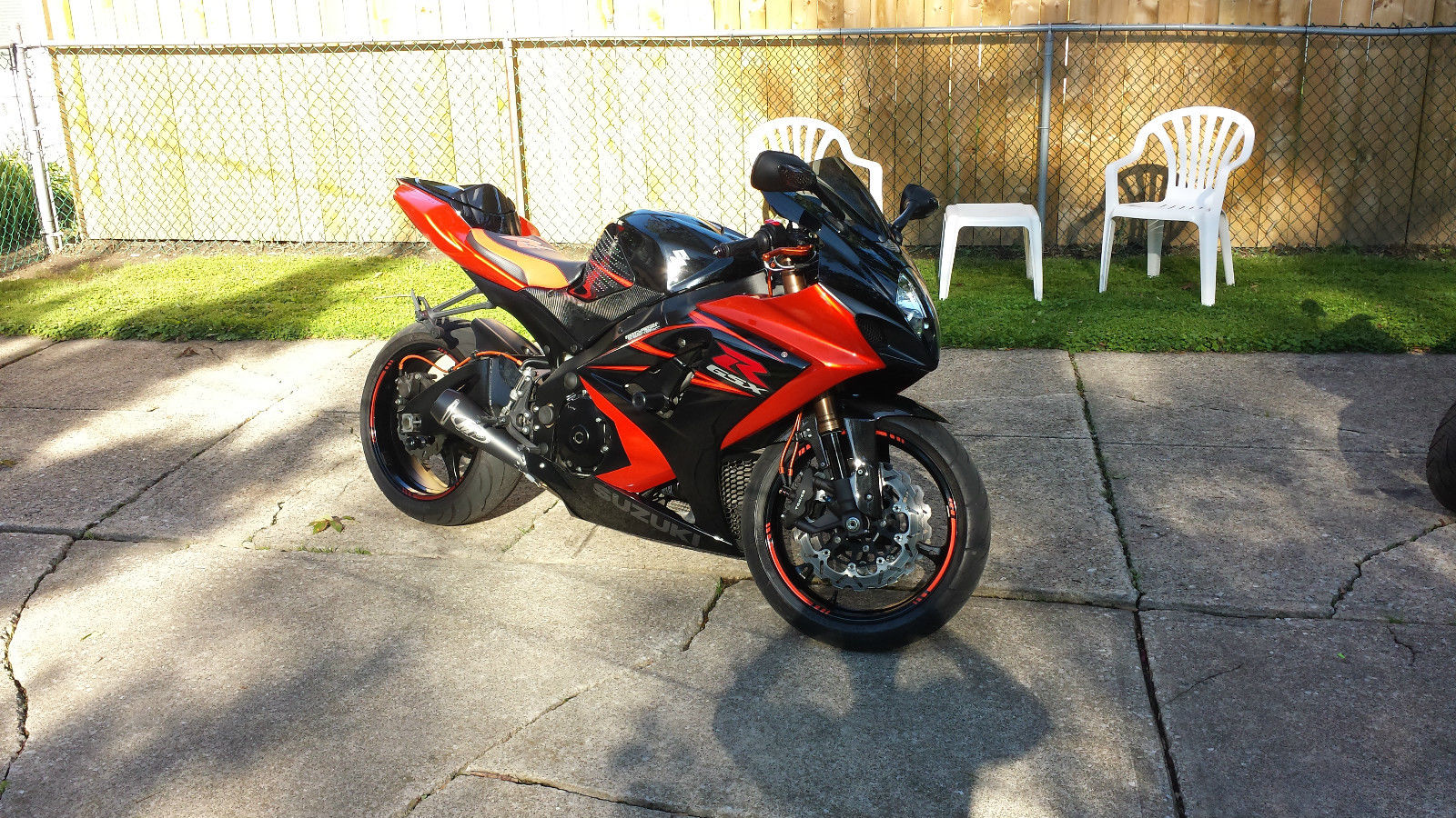 SELLING A HARD TO FIND VERY RARE BURNT ORANGE AND BLACK GSXR 1000 WITH ONLY 15. 00 MILES AND COUNTING. THIS BIKE IS IN MINT CONDITION. WAXED/DETAILED AND STORED UNDER A COVER IN MY GARAGE AFTER EVERY RIDE. BIKE HAS EVERY BOLT ON PREFORMANCE MOD THAT CAN BE DONE. ONLY TOP QUALITY PARTS USED ON THIS MACHINE. PREFORMANCE MODS ARE: UPGRADED MASTER FRONT BRAKE CYLINDER. RAIDED ORANGE BRAKE LINES. EBC PADS. GRALFER ROTORS. FRONT N REAR WITH NEW FULID. SET VALE BYPASS. BAZZAZ O2 ELIMINATER. M4 SLIP ON WITH BAFFEL REMOVED. BAZZAZ Z BOMB (removes top speed limiter). MC RACE FILTER. MOG BLOCK OFF PLATES. YNOJET POWERCOMMANDER V . ONTINENTAL STICKY TIRES (AT START OF THE SEASON) REAR HAS 60%. TEALTH/SUPERSPROX 520 CHAIN KIT WITH EK GOLD CHAIN. GOLD SPROCKET. ATCHING ORANGE SHORTY LEVERS. USTOM DYNO MAPPED PUT DOWN 187 HP TO THE WHEEL BIKE IS SUPER FAST!!
