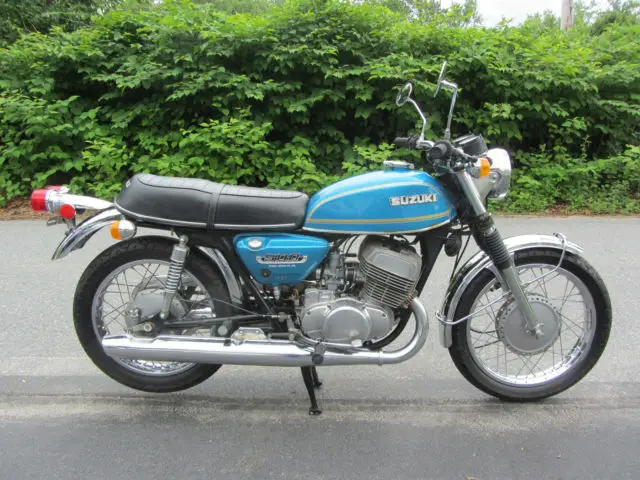 Engine: The bike is all stock. I have done a lot to it but it needs a little more tinkering to be a perfect running example. The bike has a New battery, ew points and condensers, ew spark plugs, ew air filter, ew fuel petcock, ew oil and the carburetors were ultrasonically cleaned. I also added an in-line switch at the oil injection tank to turn it off while it is in storage. The bike starts first kick and runs great at idle. When riding the bike it gets to around 3K RPM then loses power. The engine never shuts off it just won’t make any more power and I am not sure why. The bike has 140psi across both cylinders. I don’t have any more time to diagnose the problem. The bike does shift through all gears with no problems. Everything on the bike works, il injection, ights etc etc. Body: Cosmetically the bike is in excellent shape. The nicest original I have seen in person. The paint is original. Small ding on the front fender but that is all. There are a few scratches here and there due to age (40) years old SEE PICTURES. The inside the gas tank has been coated by the previous owner. The chrome is very nice and the seat is perfect. This is a stock example except for the handlebars. The bars look great and feel good but Suzuki still sells the stock handlebars if desired. The engine looks great. The bike could be polished up to look even better. Examine pictures for condition. Chassis: The tires are like new. The brakes work great. The right front fork boot is torn and it could use a fork service. The bike is sold with the original owner’s manual, clean Michigan title and bill of sale and it is sold AS IS V.I.N. T50079188 I think I have gone through everything. Don’t miss out. Examine all pictures and ask any questions before bidding. If you are reading this I am sure that you are familiar with these old bikes.The bike is SOLD AS IS no warranty. Buyer must contact me within 24hrs of auctions end.
