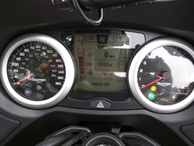Perfect Like New Condition 2013 Triumph Trophy SE. Original Owner, urchased new in Fall of 2013. Selling due to Heath reasons. Bike has been dealer maintained. If you are looking for the perfect touring sport bike, his is it. There are 3 seats that come with it, tandard stock seat, riumph Low seat and a custom made Corbin touring seat. Bike is loaded with Electronic Cruise control, hrottle by wire, lectronic suspension control for loading and riding modes, an be changed on the fly. Windshield is electronically adjustable on the fly with memory setting. Satellite radio, M/FM/Aux plus Bluetooth and WX. Liquid cooled, speed shaft drive, 214 cc, 34 HP, edline at 10,000 rpm, BS. Has top touring trunk with back rest for passenger and 12v power outlet in trunk (charge your phone while you ride). Has Tom Tom GPS on Triumph bracket. 2 side outlets for plugging in heated gear (rider and passenger). 2 customizable electronic digital displays can be changed to show various read outs, PS, pg, iles to empty, allons used, allons remaining, tc. Tires are original and in great condition with about 3-4000 miles remaining on treads. Saddle bags and top trunk fullyremovablewith key. Many other options.