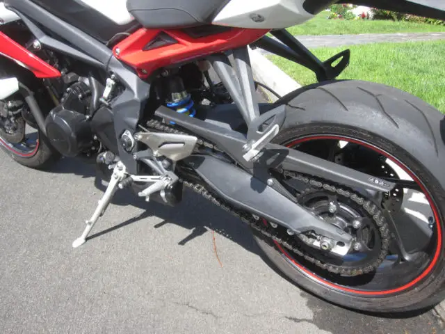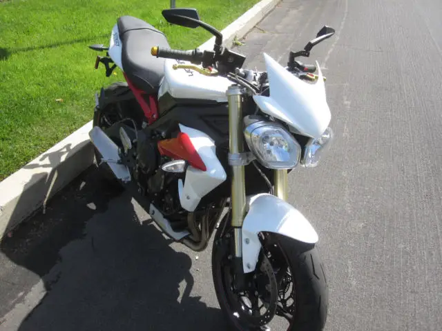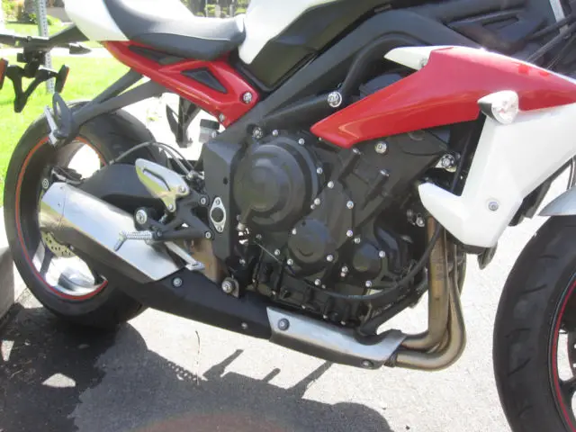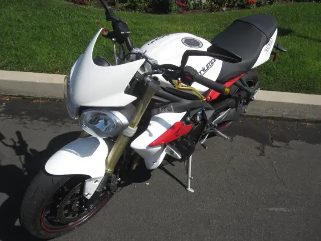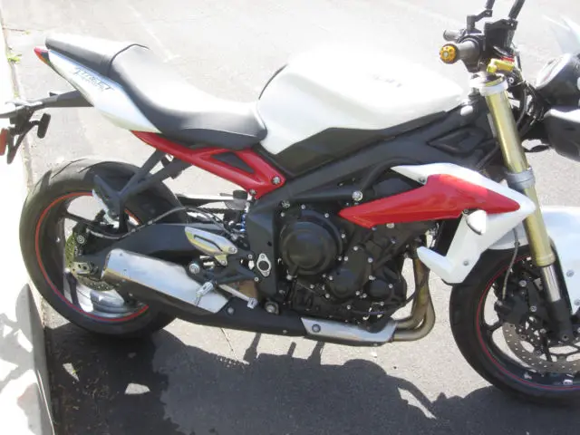 The engineers at Triumph have created the ultimate in finely honed, thrilling super sport performance, ackaged in a stunning street fighter style, ith the Street Triple R. To start with, here was no better bike than the Street Triple to base it on. It already had the advantage with a class leading engine and awesome, ocused looks. For the Street Triple R they've added high-end adjustable suspension and radially-mounted four-piston brakes, harpened the geometry and given it a few visual tweaks that tell you this bike is different,with 106 hp. Nothing else comes close to the Street Triple R,look at the pictures goo, there is a small dent in the front of the exhaust,and the radiator,it does not affect anythin, it runs and drives like the rocket it is,it is a salvage certificate that's why it has a low price,tags are good until Ma, email or call with question.Norm at 818 407 1868