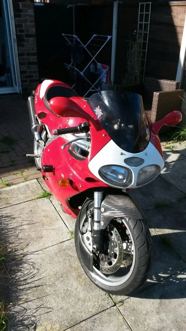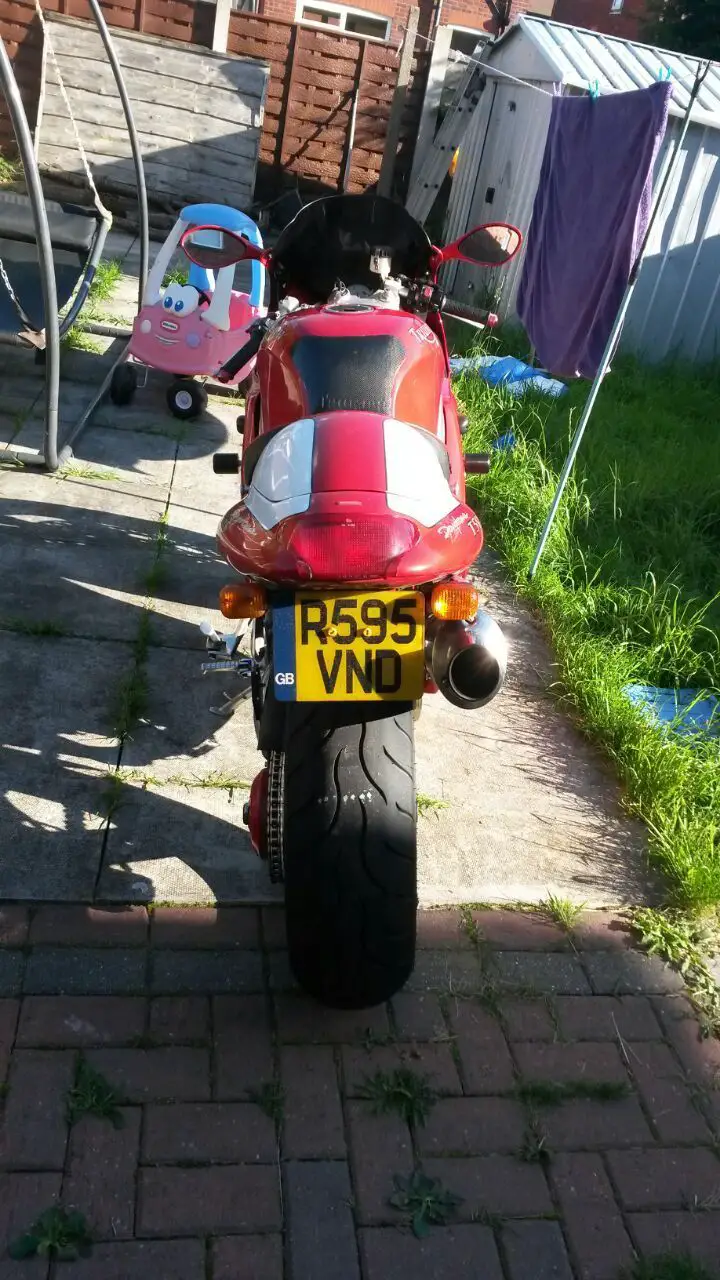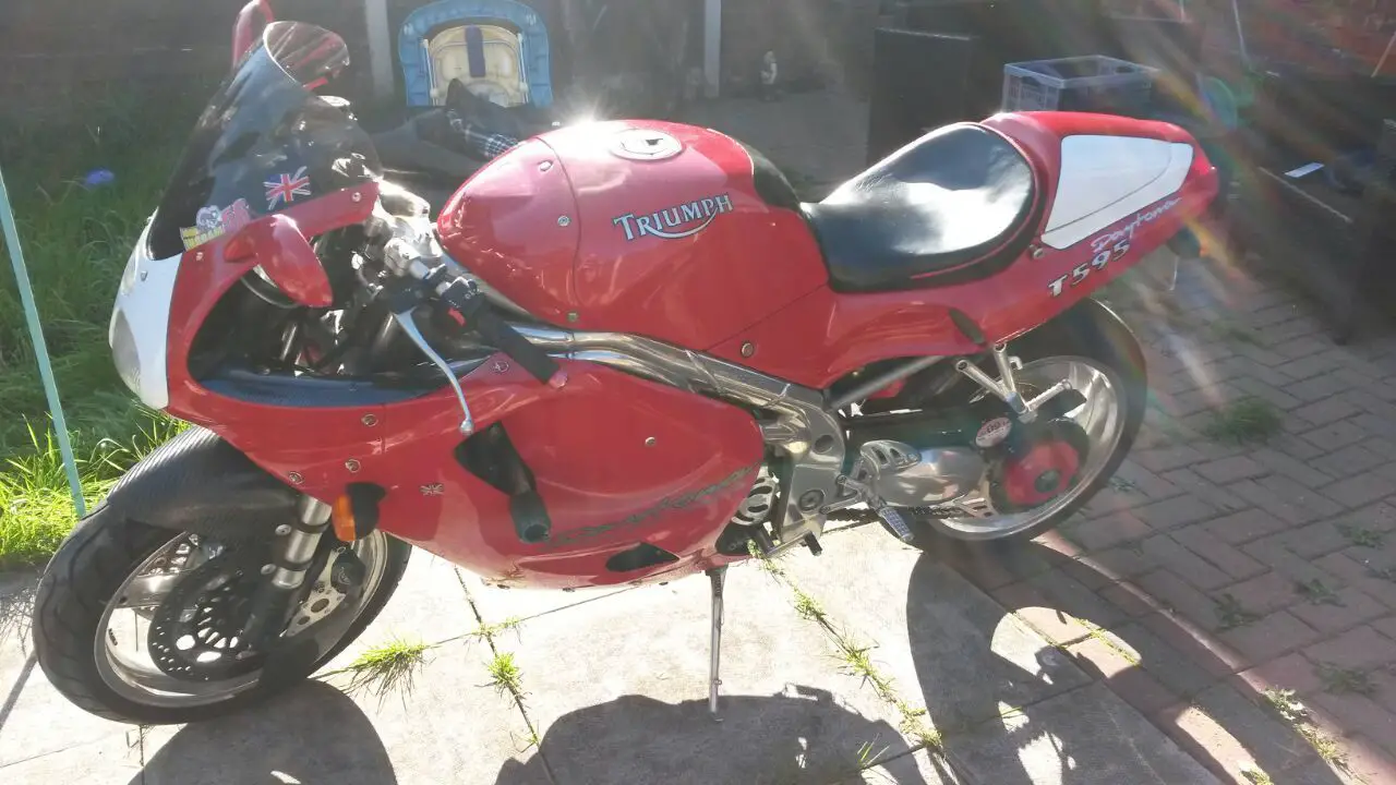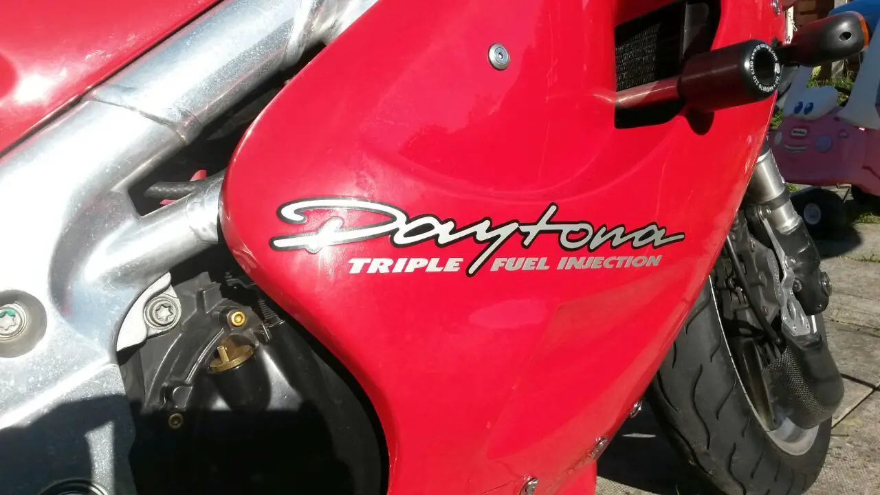 HERE I HAVE A 1998 'R' REG TRIUMPH T 595 DAYTONA IN RED. IT HAS A VERY LOW MILEAGE OF 25092 MILES AND COMES WITH A FULL RACE EXHAUST SYSTEM. CARBON HUGGER AND CARBON END CAN. DOUBLE BUBBLE TINTED SCREEN AND MADE TO MATCH SEAT AND COWL. THERE IS ALSO SOME SERVICE HISTORY AND PLENTY OF LIFE LEFT ON THE TYRES. THE BIKE IS IN EXCELLENT CONDITION AND VERY CLEAN. MOT UNTIL MAY 2015 AND TAX UNTIL SEPTEMBER 2014. I WILL ALSO GIVE YOU THE ORIGINAL SEATS AND EXHAUST.