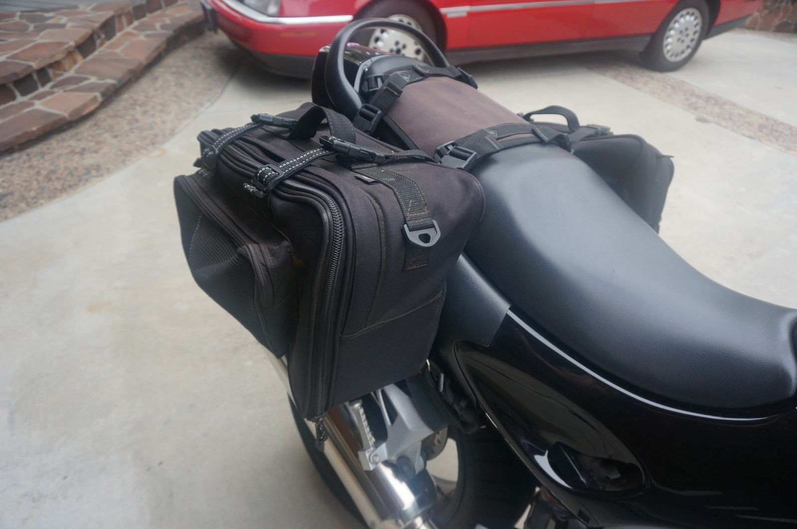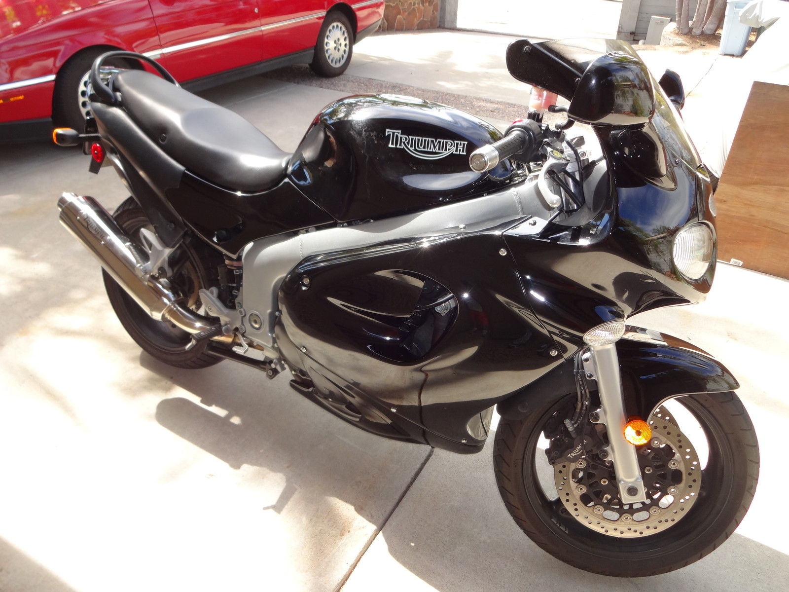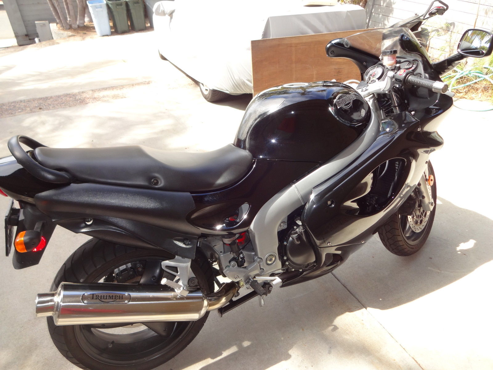 All Black. Has Triumph soft saddlebags. Aftermarket Triumph performance muffler. New battery. No problems. Slight scratches on muffler from a parking lot fall. Fairing repainted at that time. A great bike that I just never use. Very powerful and excellent handlingAlways stored indoors. Never had any mechanical problems. Triumph soft saddlebags hold a ton. pictures show the right side bag unzipped into large capacity feature. while the right bag is shown in the zipped. smaller. mode. Factory says 85mph max with saddlebags in place. Check out the reviews of this motorcycle by searching "Triumph Sprint ST 1999 review"These are truly excellent modern motorcycles. great for long distance rides.