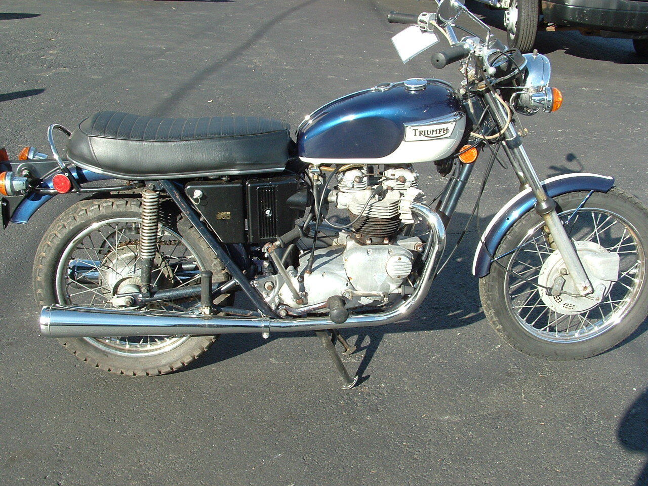 I have for sale here a nice unmolested 1971 Triumph tiger 650. I believe it is mostly original except for the mufflers. it is a good running unit and was last ridden this spring. but not much since then. just trying to thin out the collection. my reserve is a fair price I believe and I do have a clear title for this bike. Feel free to ask me any questions and i'll gladly try and answer them. The frame vin. is HE28799 TR6R and the motor numbers are HE28799. so they are matching. Also any other specific pics you might like just ask and i'll get them to you.