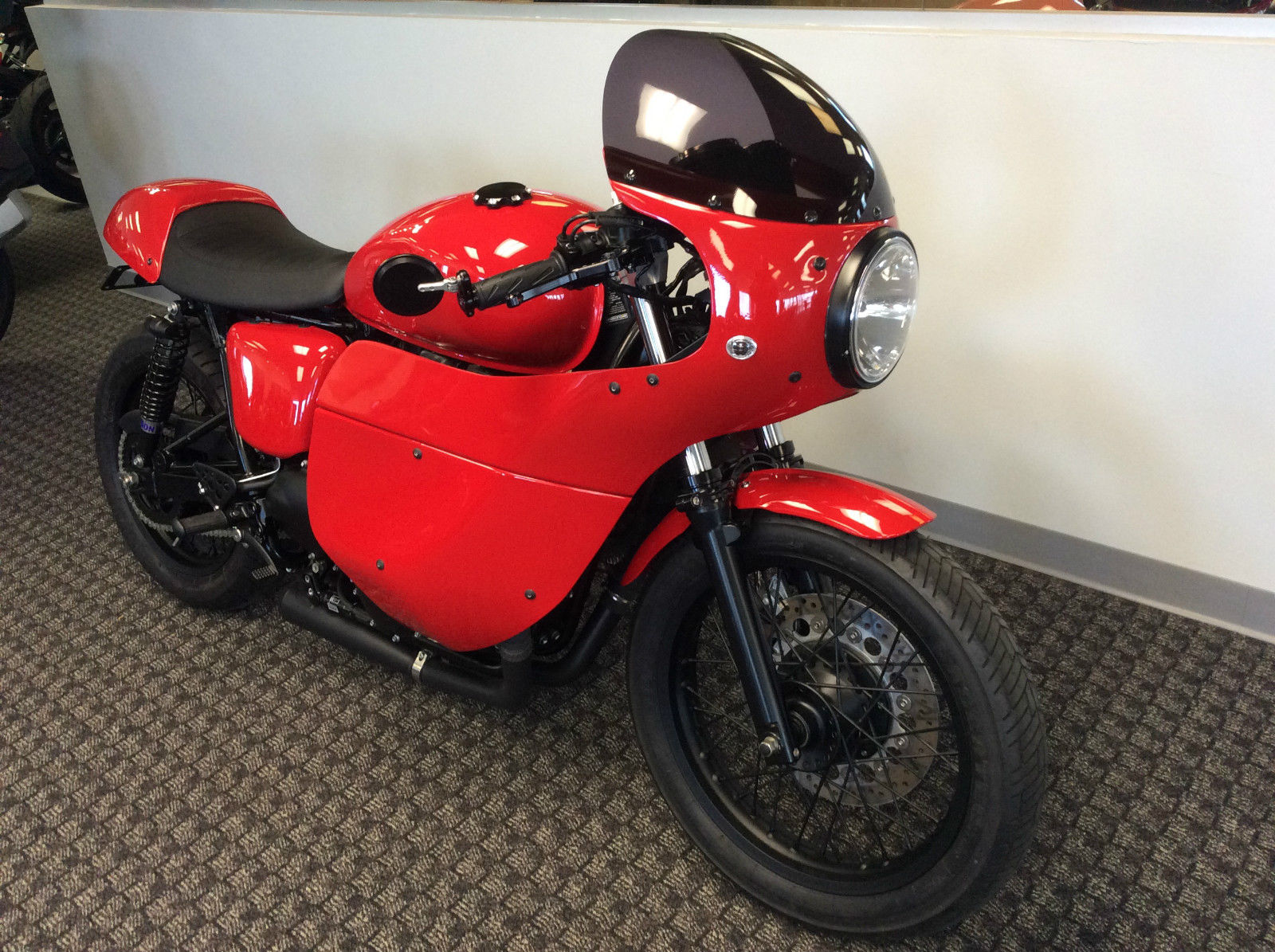 This 2014 Triumph Thruxton has been customized by Motorcycles of Milwaukee and is loaded with extras! The first thing you will notice is the wrap-around fairing and the Diablo Red paint. If you look at the under carriage of the bike you will also notice the D+D dual mufflers that provide the bark for this custom machine. When you take a closer look at the bike you may also notice that we have eliminated the rear fender and have changed out the taillight and signals for British Customs parts. The Hagon rear suspension has also been changed out to allow for better adjustment and that special ?ˆ?blacked out look. ?ˆ? To keep consistent with the blacked out theme; the wheels. headlight ring. exhaust. PSR brake/clutch levers. rear sets. foot shifter/brake. rear turn signals. and British Customs rear taillight have all been blacked out. To fit the fairing the stock gauge bracket and handle bar were removed in favor of a flatter one and LSL clip-ons. Other smaller additions include custom fast idle knob. black heat wrap. Moose heat shield. CRG bar end mirrors. and special black milled gas cap. This is a new bike and still includes the two year manufacturers warranty. Buy this bike and be the envy of everyone around you!