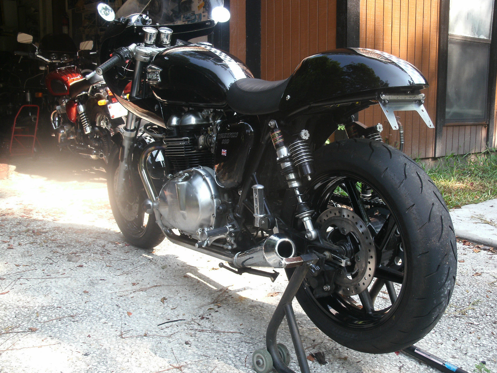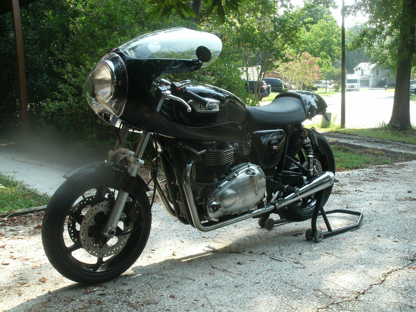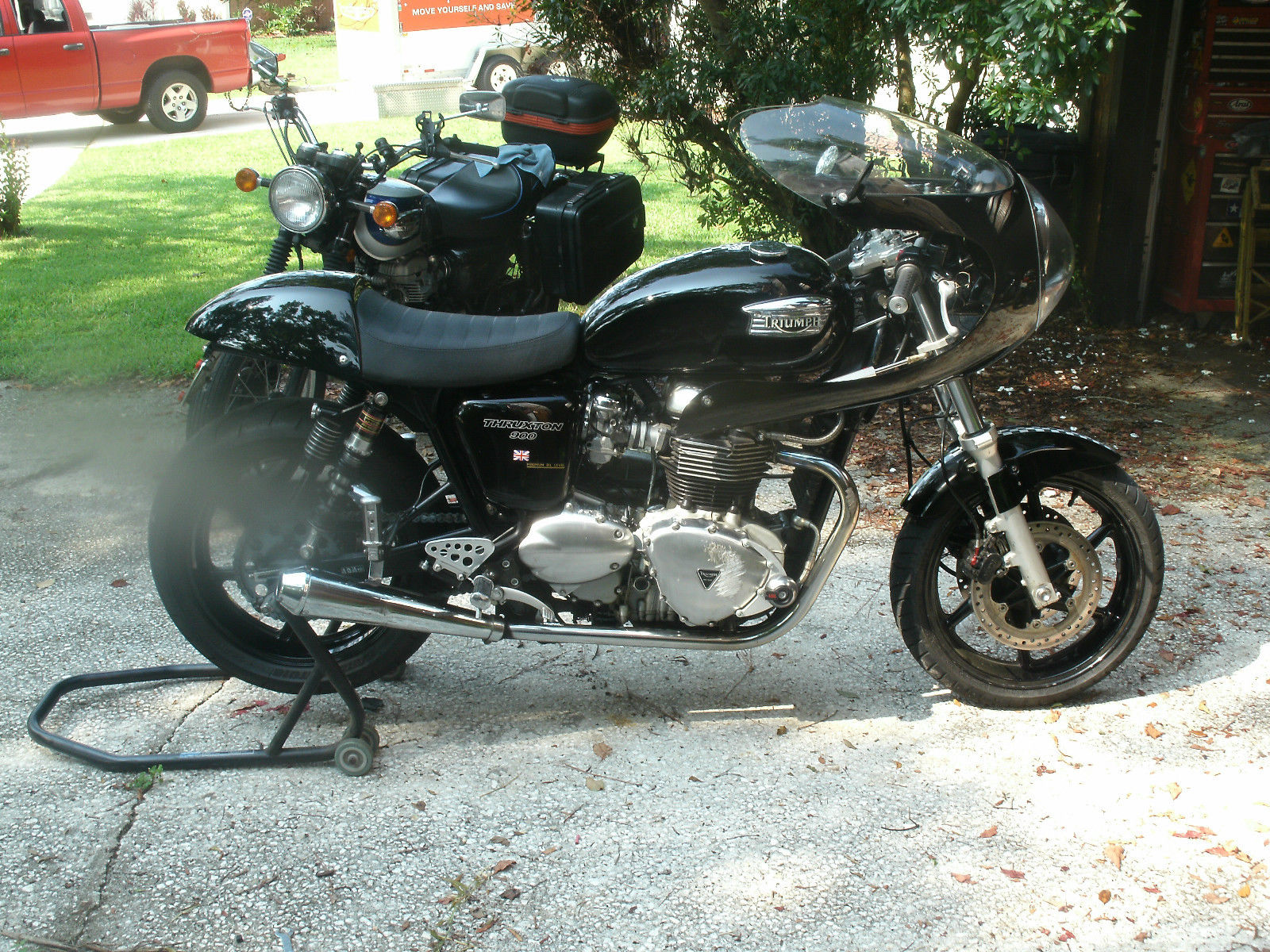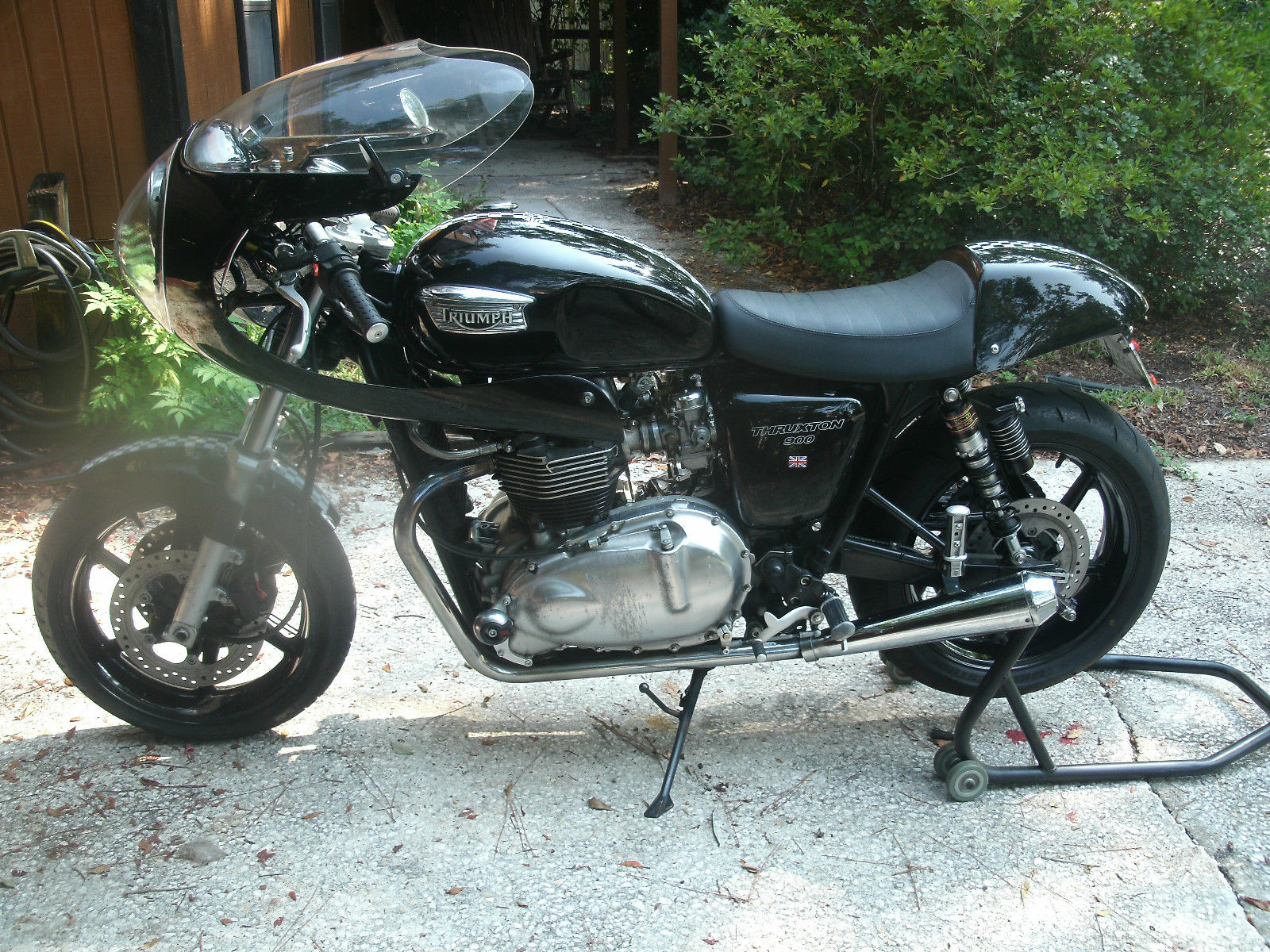 2004 triumph thruxton. As you can see this thruxton has been slightly modified. Honda f3 front forks(all racetech guts). nbsp; f2 wheels to retain the Speedo drive. Works performance pro racer shocks. nbsp; read/titan fairing with custom mounts. custom tail and turnsignals. Lsl case savers and steering damper. nbsp; custom instruments. nbsp; matching helmet. nbsp; custom exhaust. nbsp; and probably a bunch of stuff I forgot. runs perfect. Real head turner. This bike is being sold with a bill of sale only. no title. It was in an accident and the insurance company totaled it. I rebuilt it but haven't had time to take it down for inspection. My laziness is your gain. No warranty implied or otherwise. Shipping and pickup is on winning bidder. Feel free to ask any questions. Bike is available for viewing in the Jacksonville area and is also for sale locally. I reserve the right to end the auction early if it sells locally. Happy bidding.
