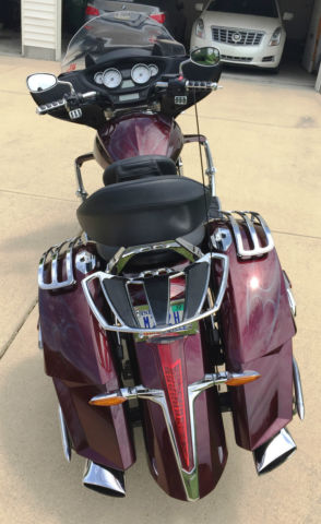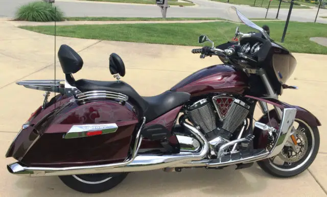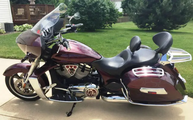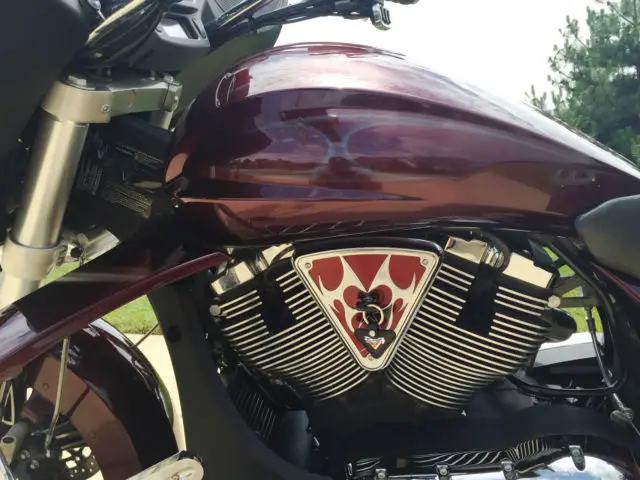 One of the best baggers on the road today. Victory has the highest owner loyalty of all motorcycle brands! I did a lot of research before I got back on a bike after 20 years. What I wanted was an American V-twin with a lot of muscle yet low maintenance. I was first intrigued after watching this YouTube video series comparing Victory and HD engines, nd then I rode one. That sealed it for me. It’s no wonder their tag line is “Ride one and you’ll own one”. The bike as less than 14K miles on it and last year I put on a new set of tires. This bike is highly customized and there is nothing like it on the road. Over $5K invested including; · Customer tribal ghost paint job · Cee Bailey windscreen · Kuryakyn grips · Custom built Go Pro camera & GPS mount · Back lit tribal cheese wedges painted to match the bike · Tribal pattern crank & clutch case covers also painted to match the bike · Kuryakyn Kinetic Driver Floorboards, ighway pegs, rake pedal · Chrome clutch cable cover · Factory seat foam replaced with memory foam · Driver backrest · Wide passenger back rest with luggage rack · Chrome front fender rail accent (currently not on the bike) · Chrome Saddle bag lid rails · Saddlebag Liners & Lid organizers · Chrome bottom rail saddle bag protectors · Chrome Oil Dipstick Thermometer · Chrome Big Mouth Exhaust Tips