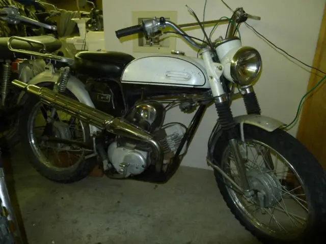 1969 Yamaha L5T Trailmaster 100cc - electric or kick start -autolube - 2 stroke - w/ 3 high or 3 low - perfect bike for backcountry trips-Yamaha brochure claimed 110 mpg! been in our family for years only 3200 orig miles - runs perfect everything works- lights electric start transmission etc. Has a new battery w/ Tune-up including carb clean . points. condenser. timing. plug. nbsp;oil. etc all serviced last year! I also have a nos rh brake perch/switch assembly that goes w/ bike. Runs Great! Fast little scrambler!MORE PIX COMINGSold AS-IS - BILL OF SALE - NO TITLESHIPS WORLDWIDEBUYER RESPONSIBLE FOR SHIPPINGCAN HOLD for YOUR U-SHIP - NO TIME LIMIT OKMAKE OFFERI ALSO HAVE A RED 68 w/ 2200 miles needs make run been sitting. THIS AUCTION IS FOR 1 BIKE WHITE 1969 YAMAHA L5T.