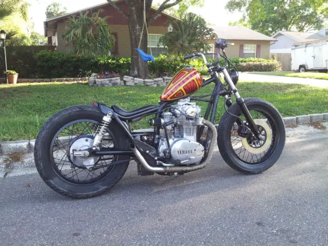 This beautiful custom machine started off as a clean and running 12k mile 1977 Xs650. We've spent many hours removing and customizing the frame and other parts. the bike runs great and sounds mean. These are very fun and powerful bikes and are still used in vintage flat track racing and hill climbs. If you have any questions feel free to ask here or visit us on our Facebook page @ Fig's Choppers and Pinstriping. We're a small out-of-the-house shop. This may be our first Ebay bike but we've been building for years and have served the Tampa Florida area. Custom Features: 2. 5" lower rear shocks 3. 5" internally lowered front forks fork tube lowers smoothed and fender mount tabs removed custom narrow handlebars metal flake black grips custom seat custom rear fender custom headlight custom exhaust with stainless turned up tips carburetors jetted for intakes and exhaust frame has been removed of tabs. unnecessary brackets. kick start only but fires on first kick always starter selenoid is wired in but no button added for electric start. Starter works fine battery box located under swing arm regulator/rectifier. selenoid and ignition switch located nicely on custom brackets just above swing arm( nothing just hanging) Alien style tank painted by Little Shop of Kolor ( check them out on Facebook) The bike has no issues and is a blast to ride. I'll be detailing it further throughout the week (polishing. etc. ) A new rear tire will be mounted before close of auction(same exact model and size) smaller tail light will be mounted too This bike turns heads everywhere and is reliable. The paint is much more vibrant in the sun than the pictures show. Happy bidding 1977 Yamaha Xs650 walk around: http://youtu. be/TiJyuqa_z7Y
