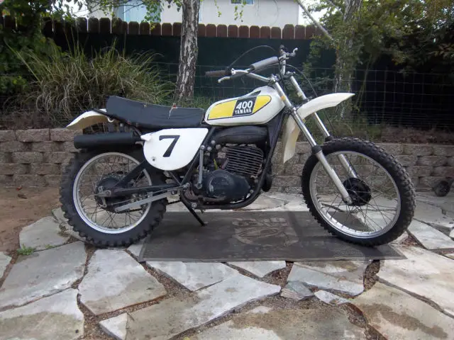 1975 YAMAHA MX400 BILL OF SALE ONLY NO TITLE FIRST YEAR OF THE MONOSHOCKHAS BEEN SITTING FOR ABOUT 3 TO 4 YEARS AND THAT WAS THE LAST TIME IT RAN HAS GOOD COMPRESSIONIT WAS BACKFIRING WHEN YOU GO TO START IT. SOME SERIOUS KICK BACK ON THE KICKSTART. I THINK IT NEEDS THE COMPRESSION RELEASE ADJUSTED. ONCE WAMRED UP THE BIKE WOULD START EASY. I'M SURE SOME TLC AND A MINOR TUNE UP AND IT WILL BE RUNNING ALUMINUM GAS TANK SO NO RUSTPLASTIC OLD AND BRITTLE JUST CRACKING SOME RUST ON UPPER FORK LEGS SOME PITTING INTAKE AIR BOOT HAS SOME CRACKING GREAT BIKE TO RESTORE OR MAKE INTO A VINTAGE RACER BUYER RESPONSIBLE FOR PICK UP AND/OR SHIPPING LOCATED IN TRACY CALIFORNIAPLEASE GET A SHIPPING QUOTE BEFORE BIDDING JUST MESSAGE ME WITH ANY QUESTIONS OR CONCERNS THANKS AND HAPPY BIDDING