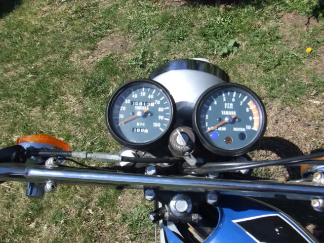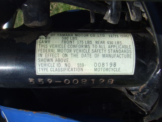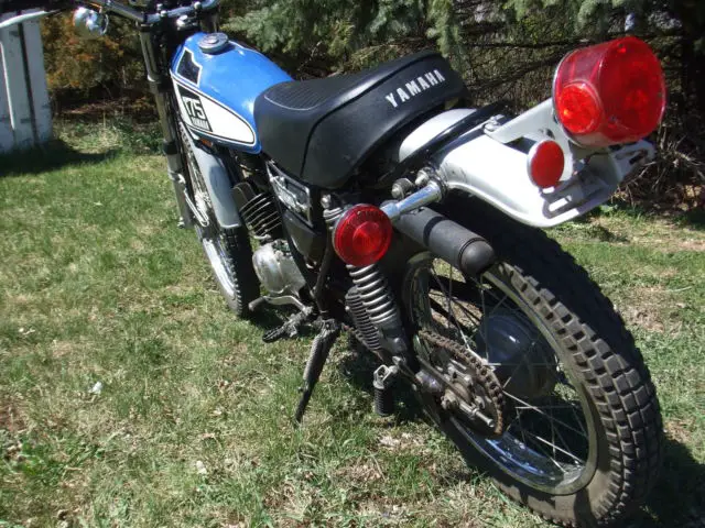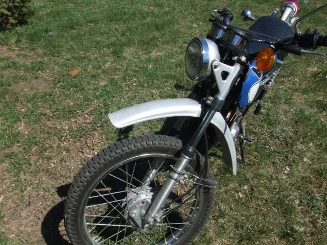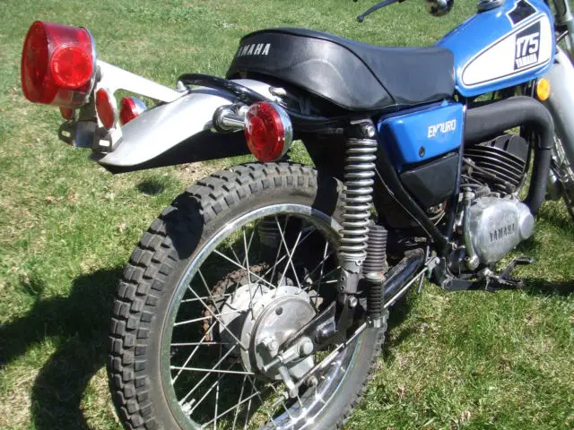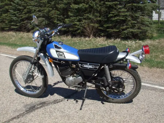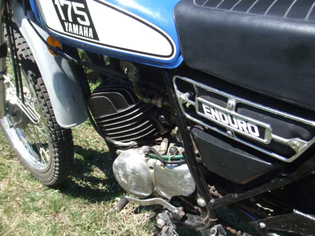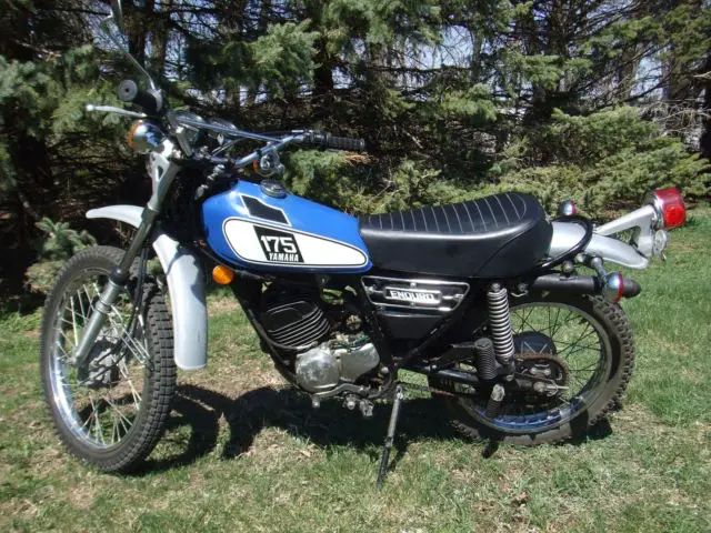 I have for sale a very nice 1975 Yamaha Dt 175 in nearly original condition. The bike runs and drives great. It starts very easy in just a kick or two. The only thing I noticed that is not original is it looks like the upper tank decals were touched up. Otherwise this machine is about as nice as you'll find one of these bikes. The seat has one small defect in the back left corner as seen in the picture. Also the front rim has a couple of rust spots on it. The blinkers work but need a new flasher element. The horn works but is weak. The brakes work fine both front and rear. The tires have good tread but show signs of weathering on the sides. This is a real nice early Yamaha DT175 and it runs and drives good as it looks. I am open to offers on it. Please call with questions. Jim 507-227-6052