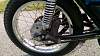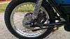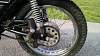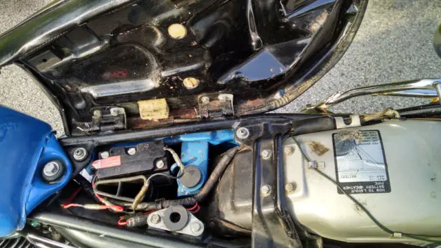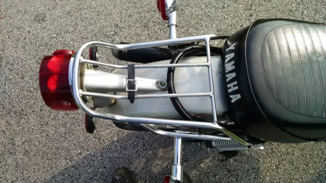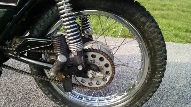 The engine has no oil leaks. Looks like previous owner tried to clean the side cases. Skid plate and frame rails show no marks. Exhaust is excellent and no dings. Has spark arrester. The oil injection works. The seat is very good with a cut about 1 inch long along the left side. Under the seat looks good and wiring looks original. Non original rubber stopper used on oil tank. Rear shocks are in nice shape and serviceable. Rear tire looks original and rim is in excellent shape. No dings or rust. Chain/sprockets are serviceable and rear brake works. Rear fender and luggage rack is in nice shape.