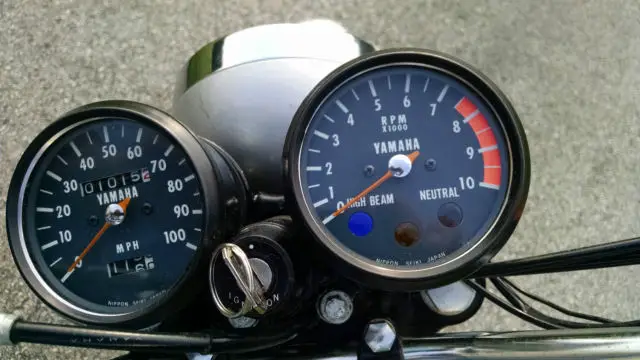 Starting from the front of the bike. Tire appears to be original, im is in excellent shape no dings or rust. All spokes are there and tight. The brake works. Front fender has a couple scratches that can be seen in the pics. Front forks show no pitting. Handlebars straight, rips original, nd all controls and switches are there and ingood working order. Tach and Speedo both work and are clear and shiny. Gas tanklooks nice.Has a scratch on the left side and a very slight dimple on the right that doesn't show up in the pics. The inside of the tank has some rust but not an issue.