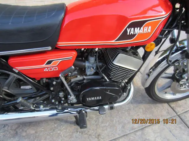 For sale we have a all original 1600 mile Yamaha RD400 .This is probably the nicest RD400 in the country.Bike has new tires,but I kept the originals for collector purposes.I cleaned the tank and rebuilt the carbs.I installed new points and plugs and timed it.The overall condition for a bike 38 years old is unbeliveable.It also has its original tool kit under the seat.Bike has clean California title and is registered now.This bike is collector quality.Pictures say it all.Remember its original not restored.Not perfect but VERY NICE.Any concerns call me at 909-5180599