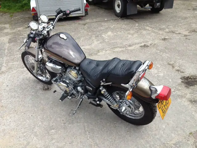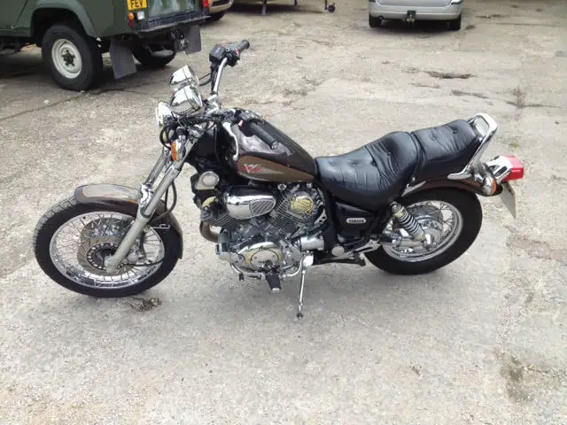 Metallic Brown / Gold. Jap Import Gold Edition - Rare Model Long MoT / Tax. Next MOT due 17/05/2015. Tax expires 31/10/2014. Part service history. Excellent bodywork. Tyre condition Good. Much sought after Yamaha Virago 750 with extremely low mileage for its year (14800 kms) 9. 00miles. . Japanese Import. hence the lovely condition. KPH speedo fitted with MPH converter discs. . This is a totally standard bike with lots of tax and test. shaft drive and is ready to go for the summer. . First genuine viewer will buy this bike - it is a good one!. Call or text me on 07817 353748 for quickest response or call landline on 01254 776828. . Can connect you with reliable. safe courier if required for deliveery on UK mainland. . Thanks!!. £2. 95 ovno