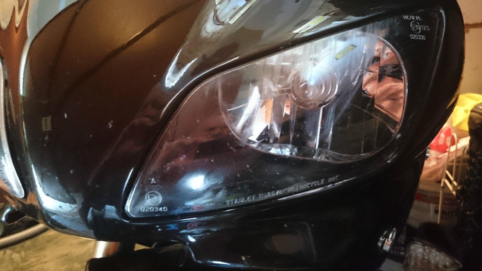 STREETFIGHTER STYLE IN METALLIC BLACK. SOME CHIPS. SCRATCHES AND A SMALL PAINT BLEMISH IN LOWER FAIRING AND CRACK IN REAR COWL.