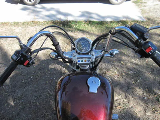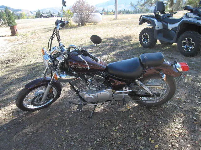 Yamaha's profilation of this bikeLight weight and a seat just 27 inches from the pavement make the V Star 250 a great trainer as well as a great choice for riders who appreciate the fun that comes in small packages. General informationModel:Yamaha V Star 250Year:2009Category:Custom / cruiserRating:68. 9 out of 100. Price as new (MSRP):US$ 3790. Prices depend on country. taxes. accessories. etc. Engine and transmissionDisplacement:249. 00 ccm (15. 19 cubic inches)Engine type:V2. four-strokeCompression:10. 0:1Bore x stroke:49. 0 x 66. 0 mm (1. 9 x 2. 6 inches)Valves per cylinder:2Fuel system:Carburettor. 26mm MikuniFuel control:SOHCIgnition:TCICooling system:AirGearbox:5-speedTransmission type. inal drive:ChainFuel consumption:3. 01 litres/100 km (33. 2 km/l or 78. 15 mpg)Greenhouse gases:69. 8 CO2 g/km. (CO2 - Carbon dioxide emission) Chassis. suspension. brakes and wheelsFrame type:Steel tubeRake (fork angle):32. 0°Front suspension:33mm forkFront suspension travel:140 mm (5. 5 inches)Rear suspension:Dual shocksRear suspension travel:99 mm (3. 9 inches)Front tyre dimensions:100/18-. 19 Rear tyre dimensions:130/90-15 Front brakes:Single discFront brakes diameter:282 mm (11. 1 inches)Rear brakes:Expanding brake (drum brake)Rear brakes diameter:130 mm (5. 1 inches)Physical measures and capacitiesWeight incl. oil. gas. etc:147. 0 kg (324. 0 pounds)Seat height:686 mm (27. 0 inches) If adjustable. lowest setting. Overall height:1. 40 mm (44. 9 inches)Overall length:2. 89 mm (86. 2 inches)Overall width:815 mm (32. 1 inches)Wheelbase:1. 91 mm (58. 7 inches)Fuel capacity:9. 46 litres (2. 50 gallons)